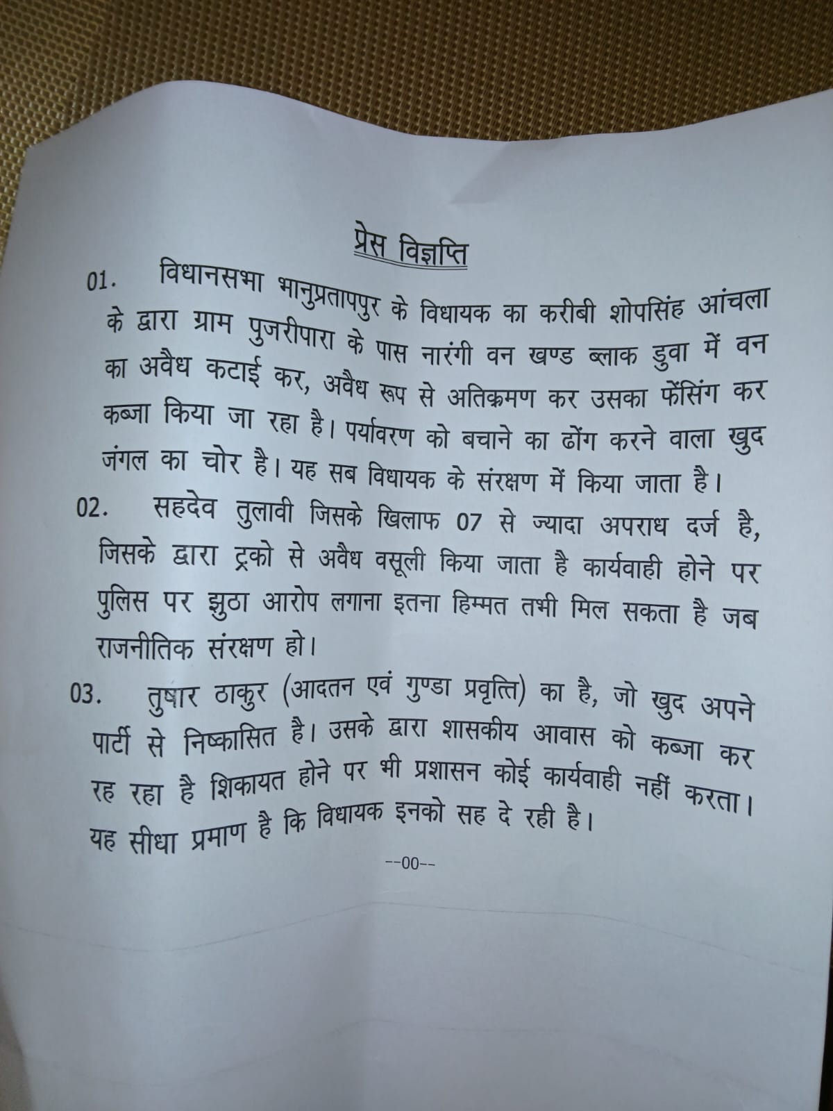 जनजातीय गौरव समाज के प्रदेश अध्यक्ष एम डी ठाकुर ने रेत मामला में प्रदर्शनकारियों के ख़िलाफ़ आरोप लगाते हुए कहा कि सोपसिंह आँचला के द्वारा पुजारी पारा डुवा में वन भूमि पर कब्ज़ा कर हरे भरे पेड़ों की कटाई की गई है,सहदेव तुलावी पर 7आपराधिक मामले दर्ज हैँ वहीं तुषार ठाकुर द्वारा भी सरकारी भवन पर कब्ज़ा किया गया है,इसको लेकर श्री ठाकुर और साथी कार्यकर्ताओं ने निष्पक्ष जांच करते हुए दोषियों पर नियमानुसार कार्यवाही करने की मांग की है, उन्होंने कहा यदि समय रहते जांच नहीं हुई, तो संगठन आंदोलन करने के लिए बाध्य होगा ।