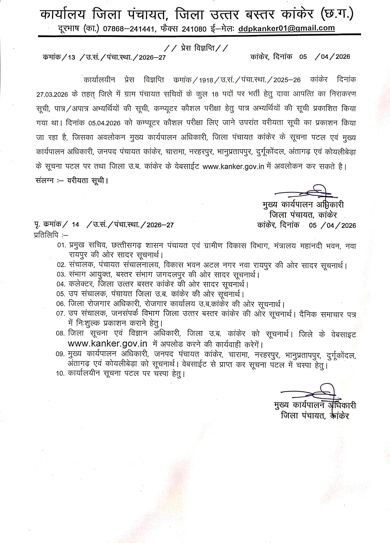 मेरिट सूची जिला कांकेर के शासकीय वेब साईट मे देखा जा सकता है।मुख्य कार्यपालन अधिकारी जिला पंचायत हरेश मंडावी ने बताया कि पंचायत सचिव भर्ती हेतु 18 रिक्त पदों पर विज्ञापन जारी किया गया था जिसमे कौशल परीक्षा उपरांत तत्काल मेरिट सूची जारी कर दिया गया है ताकि पारदर्शिता बनी रहे ।