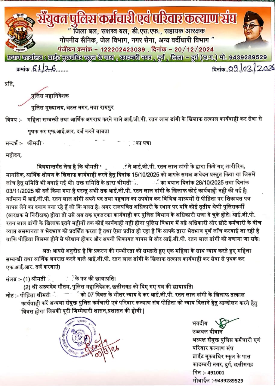 रायपुर / खिलेश्वर नेताम :- विधानसभा का बजट सत्र लगातार गर्म होते नजर आ रहा है अफीम की खेती का मामला अभी शांत हुआ नही है कि फिर से आईपीएस रतन लाल डाँगी का विवाद सामने आ गया है पीड़िता ने इस बार न्याय पाने के लिए सँयुक्त पुलिस कर्मचारी एवँ परिवार कल्याण संघ का दरवाजा खटखटाया है और संघ के अध्यक्ष उज्जवल दीवान को पत्र लिख कर न्याय की गुहार लगाई है उक्त पत्र में पीड़िता ने अपनी आप बीती बताई है और किस प्रकार उनका शारीरिक, आर्थिक, मानसिक शोषण किया गया है उसका उल्लेख किया है। पत्र प्राप्त होते ही संगठन के अध्यक्ष उज्जवल दीवान ने त्वरित कार्यवाही करते हुए राज्य के मुख्यमंत्री, गृहमंत्री तथा पुलिस महानिदेशक को पत्र लिखा जिसमें बताया गया है कि पीड़िता ने आई.जी.पी. रतन लाल डांगी के द्वारा किये गए शारीरिक, मानसिक, आर्थिक शोषण के खिलाफ कार्यवाही करने हेतु दिनांक 15/10/2025 को पुलिस महानिदेशक के समक्ष आवेदन प्रस्तुत किया था जिसमें जांच हेतु समिति भी बनाई गई थी। उक्त समिति के द्वारा पीड़िता का बयान दिनांक 28/10/2025 तथा दिनांक 03/11/2025 को दर्ज किया गया है परन्तु अभी तक आई.जी.पी. रतन लाल डांगी के खिलाफ कोई कार्यवाही नही की गई है। वर्तमान में आई.जी.पी. रतन लाल डांगी अपने पद तथा पहचान का उपयोग कर विभिन्न माध्यमों से पीड़िता पर शिकायत पत्र वापस लेने का दबाव बना रहे हैं जो कि गलत है। अगर राजपत्रित अधिकारी के स्थान पर यदि कोई तृतीय श्रेणी पुलिसकर्मी (आरक्षक से निरीक्षक) होता तो उसे अब तक एकतरफा कार्यवाही कर पुलिस विभाग के अधिकारी सजा दे चुके होते। आई.जी.पी. रतन लाल डांगी के खिलाफ इतने महीनों तक कोई कार्यवाही नही होना पुलिस विभाग में बड़े अधिकारी और छोटे कर्मचारी के बीच व्याप्त असमानता व भेदभाव को प्रदर्शित करता है तथा ऐसा प्रतीत हो रहा है कि पुलिस विभाग के अधिकारियों द्वारा भेदभाव पूर्ण जाँच करवाई जा रही है ताकि पीड़िता विलम्ब होने से परेशान होकर अपनी शिकायत वापस ले और आई.जी.पी. रतन लाल डांगी को बचाया जा सके। प्रकरण की गम्भीरता को समझते हुए एक महिला के साथ न्याय करते हुए महिला सम्बन्धी तथा आर्थिक अपराध करने वाले आई.जी.पी. रतन लाल डांगी के खिलाफ तत्काल कार्यवाही कर सेवा से पृथक कर एफ.आई.आर. दर्ज करवाने लिखा है। उज्जवल दीवान ने कहा कि पीड़िता को न्याय देने हेतु यदि 7 दिनों में आईपीएस रतन लाल डाँगी के खिलाफ उचित कार्यवाही नही की जाएगी तब सँयुक्त पुलिस कर्मचारी एवँ परिवार कल्याण संघ पीड़िता को न्याय दिलाने आंदोलन का रास्ता अपनाएगा और विधानसभा जा कर अपनी बात रखेगा यदि पुलिस परिवार विधानसभा तक जाता है या जाने का प्रयास करता है तो जरूर ही विधानसभा का यह सत्र और गर्म नजर आएगा।