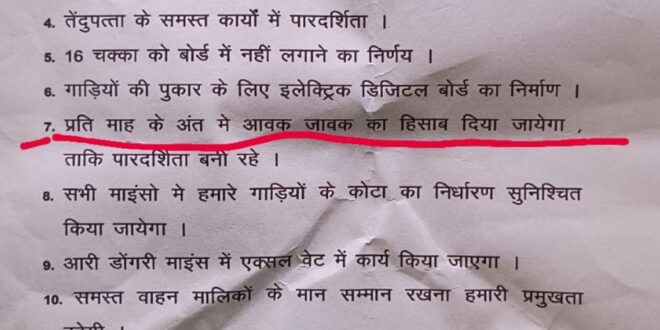 वर्ष 2020 में हुए चुनाव के दौरान प्रत्याशियों ने कई बिंदुओं के साथ घोषणा पत्र जारी किया था जिसमें मुख्य रूप से प्रत्येक माह के अंत में आवक जावक का हिसाब देने की बात कही थी, लेकिन अब तक आवक जावक की जानकारी सार्वजनिक नहीं करने से संघ के सदस्यों में काफी नाराजगी देखी जा रही है । सदस्यों ने कहा कि घोषणा पत्र में कुल 10 बिंदु शामिल है पर अभी तक एक भी घोषणा पूरा नहीं हुआ है,इससे प्रतीत होता है कि परिवहन संघ के अध्यक्ष और अन्य पदाधिकारियों के द्वारा संघ में प्राप्त राशियों का बंदरबांट भी किया गया है । भानुप्रतापपुर परिवहन संघ में लगभग 850 से गाड़ी चल रही है क्षेत्र में संचालित विभिन्न माइंसो के माल परिवहन करते है । जिससे कई ट्रांसपोर्टरो की रोजी रोटी जुड़ी है ।